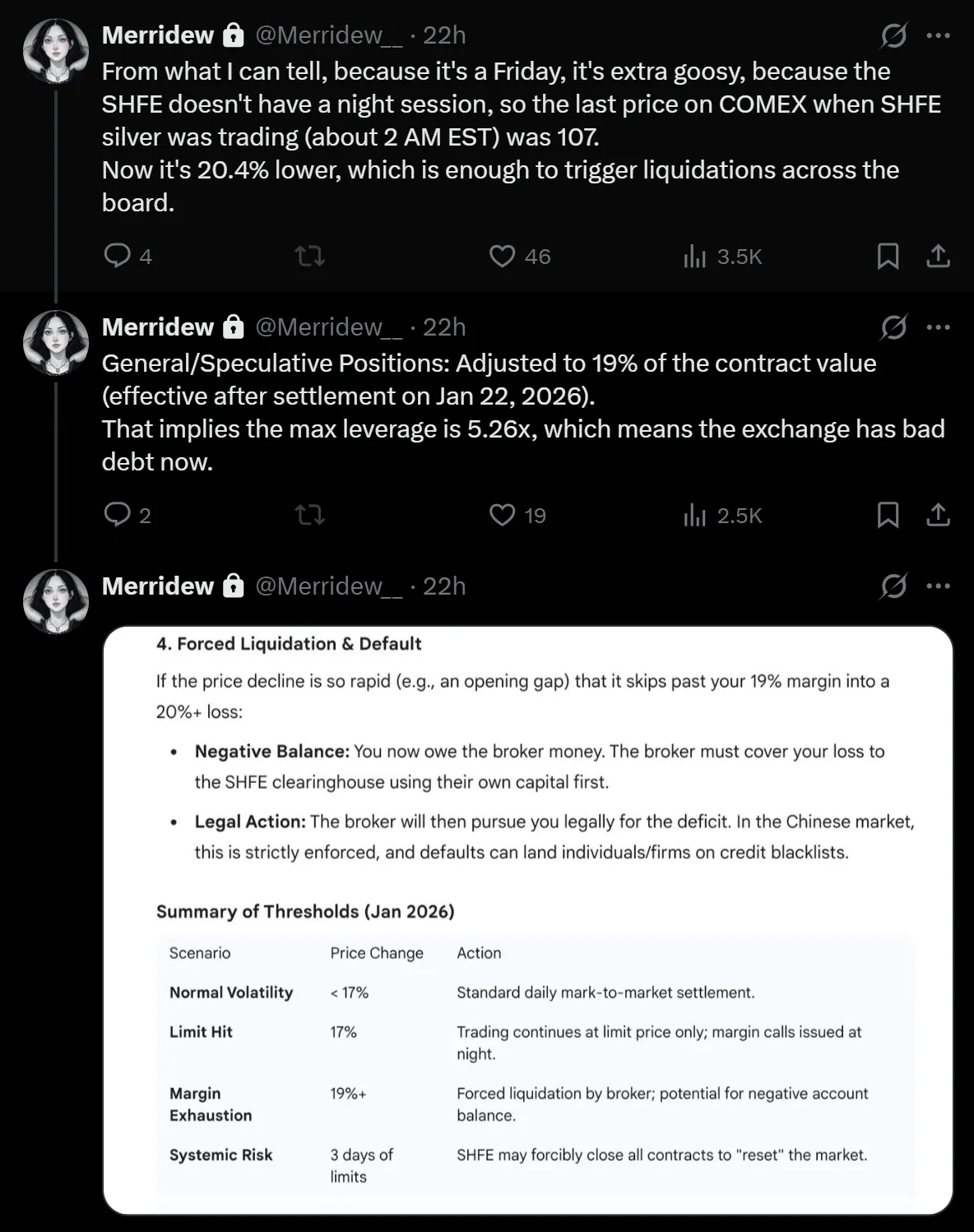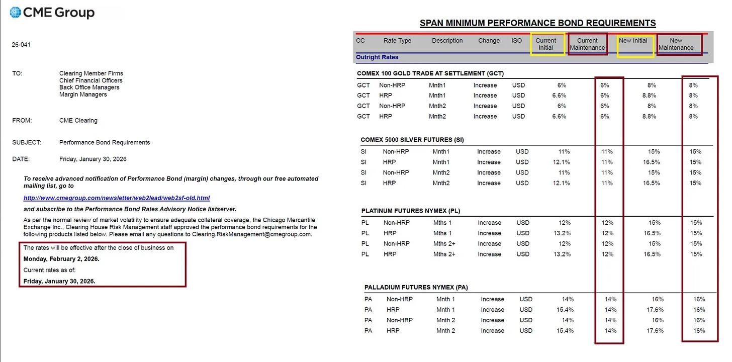 另 CME 於週五再度提高保證金,但須注意:因價格下跌約 30%,即使保證金比率上升,多頭淨現金提取額度可能微乎其微——單位白銀保證金雖大增,但總額大致持平。