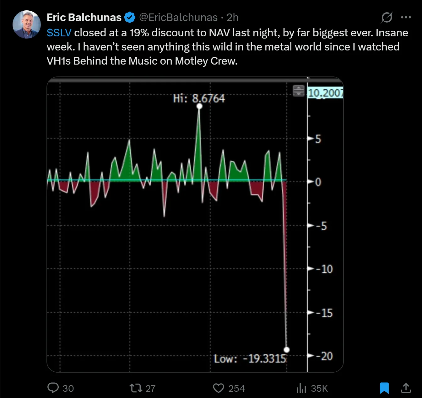 此現象主因 SLV 採用倫敦清算價計算 NAV(而最慘烈時段倫敦已休市)。從週五盤中價格觀察,該 ETF 與期貨走勢高度一致。