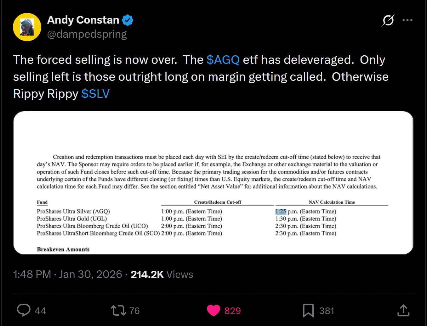 除非週日晚中國市場出現極端去槓桿行動,否則 AGQ 抛售潮已成過去式。任何顯著反彈,將產生反向作用——猶如空頭看漲期權(Short Call Option),迫使持有人於上漲時補倉。我押注中國市場不會一瀉千里;若真見強制清算,股市亦難倖免。