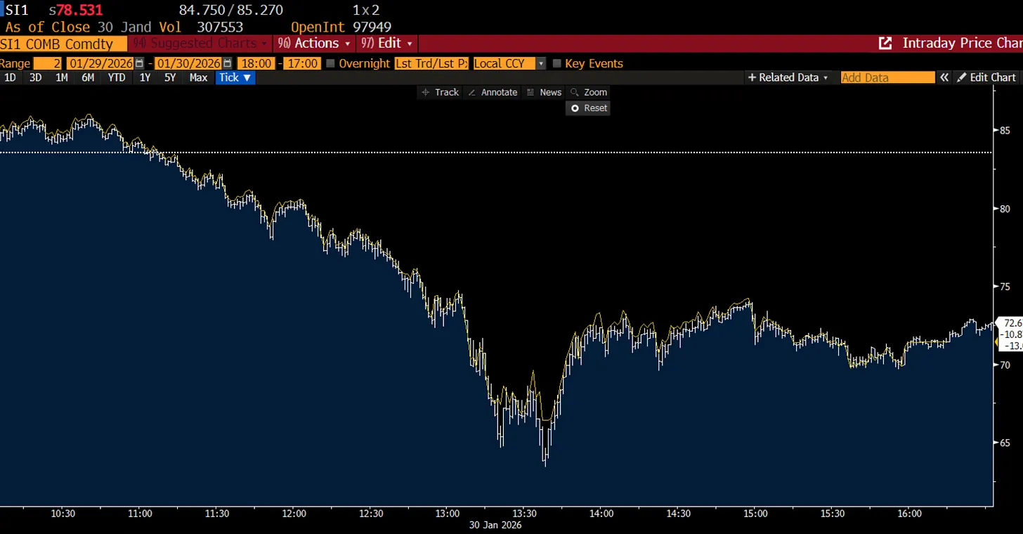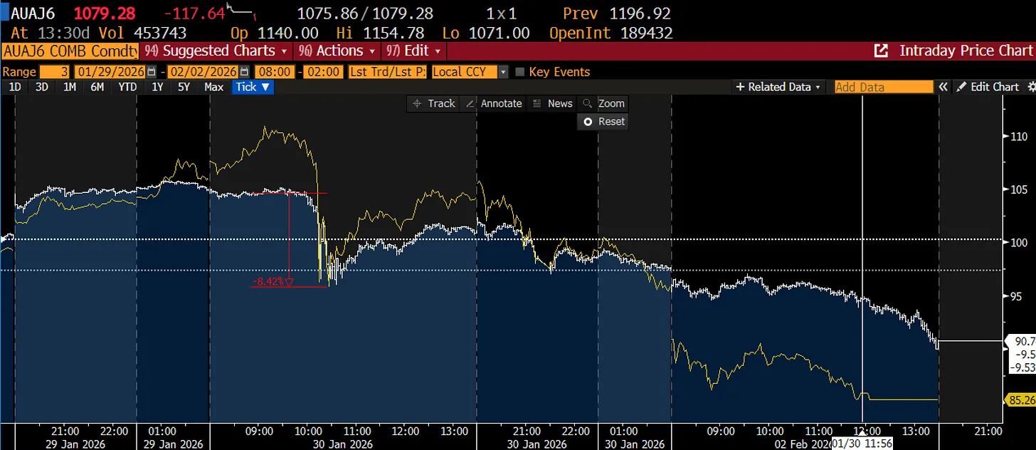 此為白銀 275 年日收益率數據。上週五跌幅,位列該金屬有紀錄以來最大單日跌幅之一,堪比「金銀復本位制終結」、「亨特兄弟崩潰」及「2020 年 3 月熔斷」——唯獨不同的是:這次發生於 1 月一個毫無預兆的普通週五。