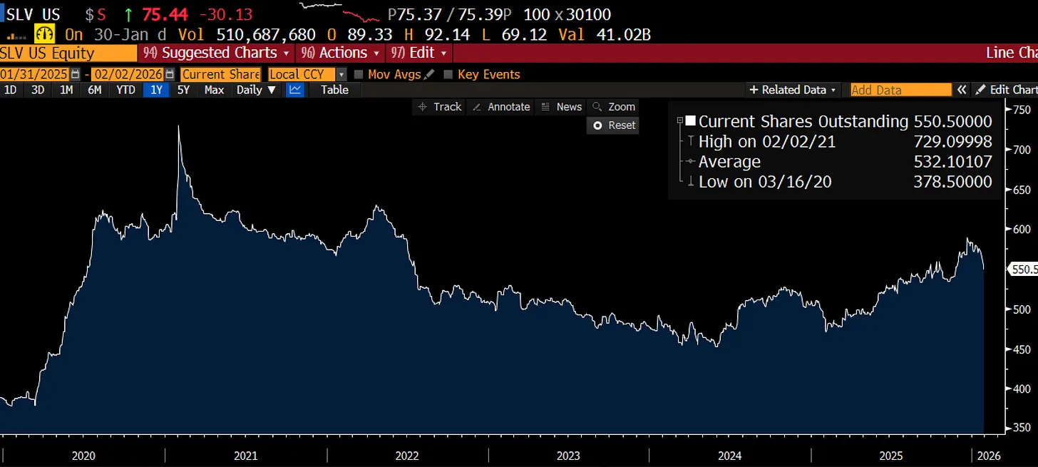 首先,SLV 股價於週五大跌前已開始走弱。價格下跌,意味名目風險敞口(Notional Exposure)已大幅縮減。