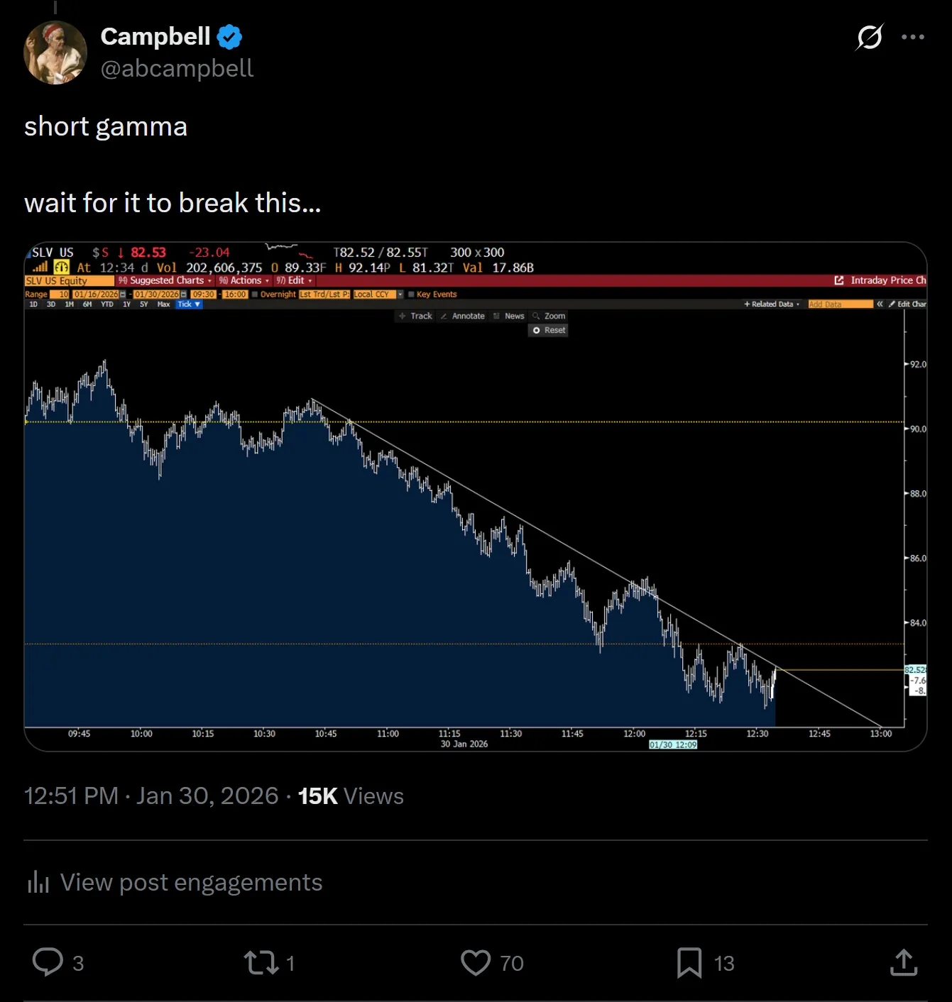 導讀: 上週五,白銀市場遭遇歷史性「洗盤」(Washout)——單日暴跌達 6-Sigma 級別。前橋水基金(Bridgewater)研究員 Alexander Campbell 於事後撰寫這篇深度反思長文,不僅從金融工程角度拆解短 Gamma 效應、槓桿 ETF 調倉踩踏、倫敦–紐約–上海三地定價博弈等核心機制,更坦誠揭露職業投資人在公眾責任與理性決策間的內在撕裂。