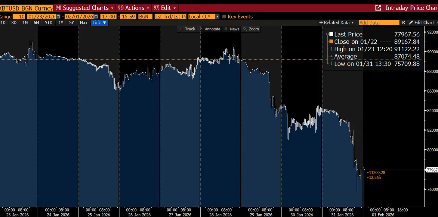 比特幣走勢亦不樂觀,似為強制拋售、量子計算擔憂及對 MSTR 問題預期之綜合結果。