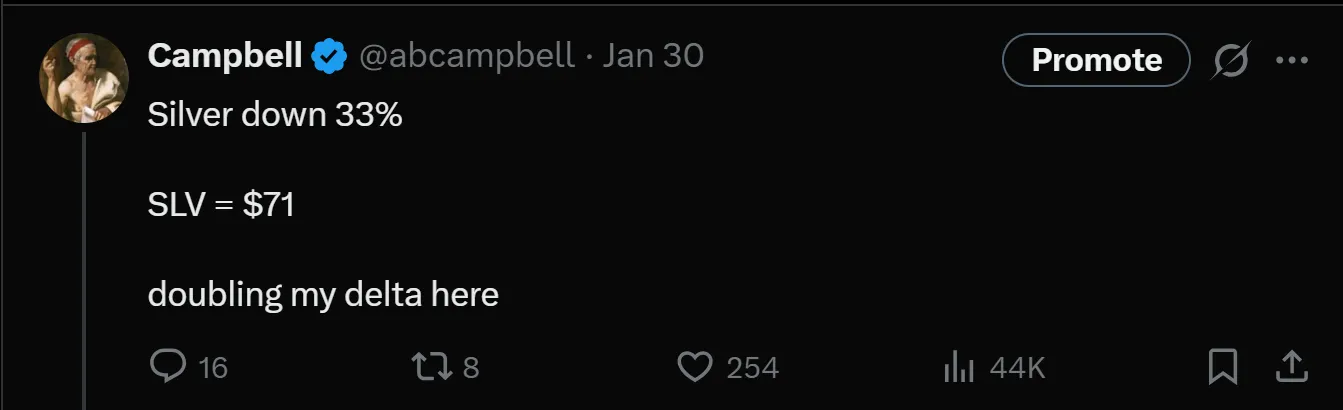 於幾分鐘前等待初步築底信號後,我在 71 美元買入 SLV,並透過買入股票、買入看漲期權、賣出下方行權價之看跌價差(Put Spread)將部位加倍——即便未能跑贏自身操作,亦冀望藉市場關係之 Alpha 盈利。