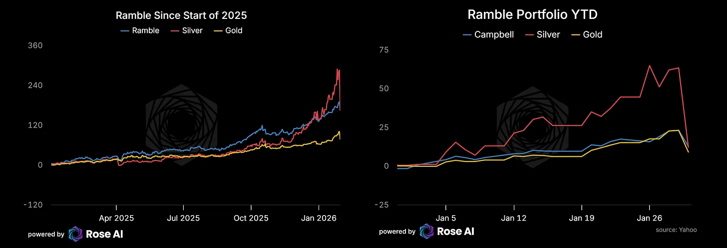 實際上,我尚有第四種短波動率暴露:因慣用看漲價差(Call Spreads)與蝶式價差(Flys),隨行權價上移,我持續「展期」(Rolling)期權,遂生虛假安全感。終場,白銀虧損 2%,黃金虧損 2%;加計銅及其他部位,全天虧損 8%,帶傷未倒。年初至今(YTD)報酬率為 12.6%,自 2025 年 1 月累計報酬達 165%。