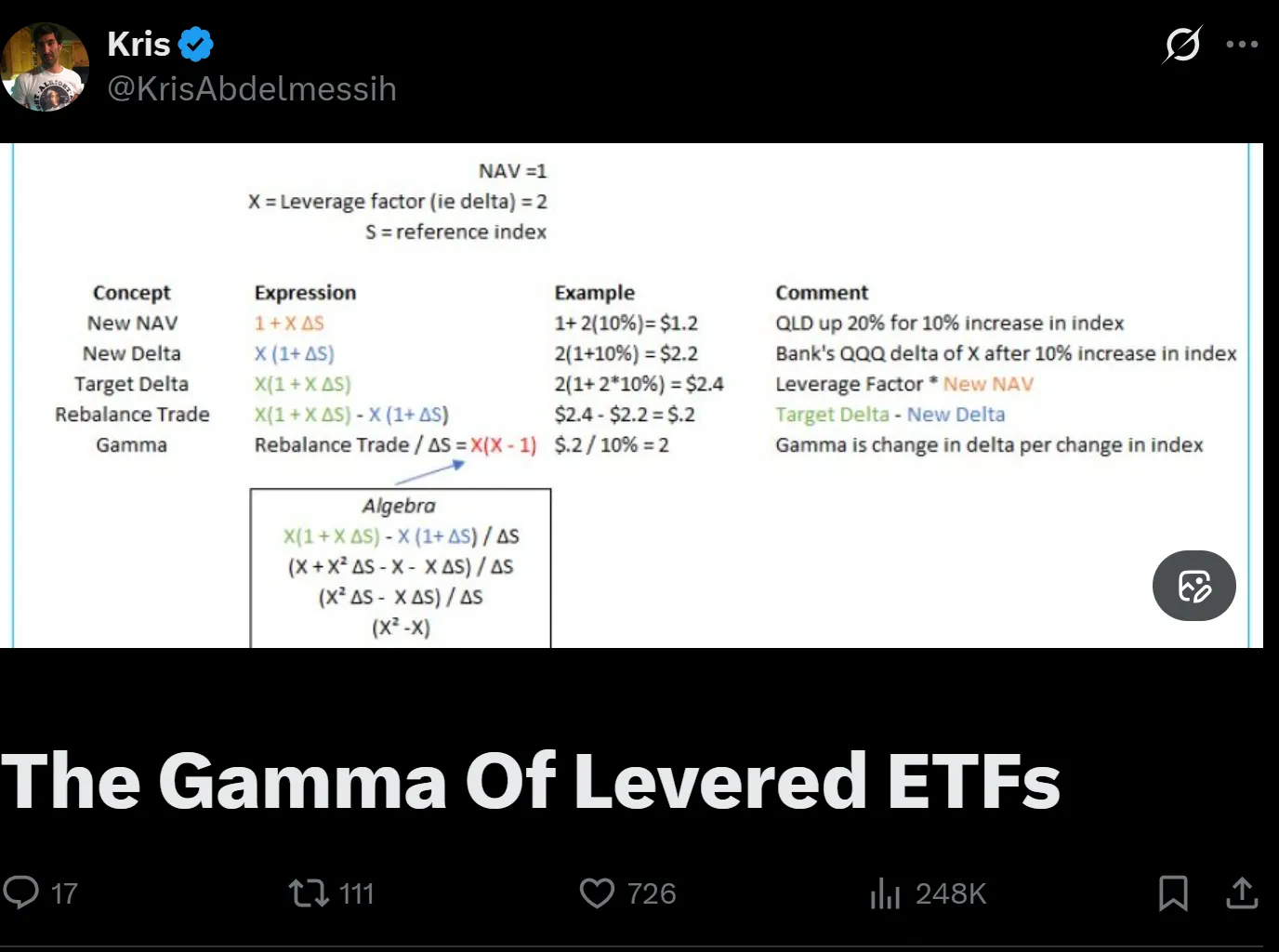 第三種短波動率成因令我驚訝:我未察覺「雙倍槓桿白銀基金 AGQ」已累積 50 億美元資產,意味其持有 100 億美元白銀(透過期貨)。該基金每日「再平衡」(Rebalance),故當白銀跌 15%,基金實質虧損 20% × 100 億 = 20 億美元,淨值剩 30 億美元;新 Delta 為 60 億美元,須拋售 40 億美元白銀!