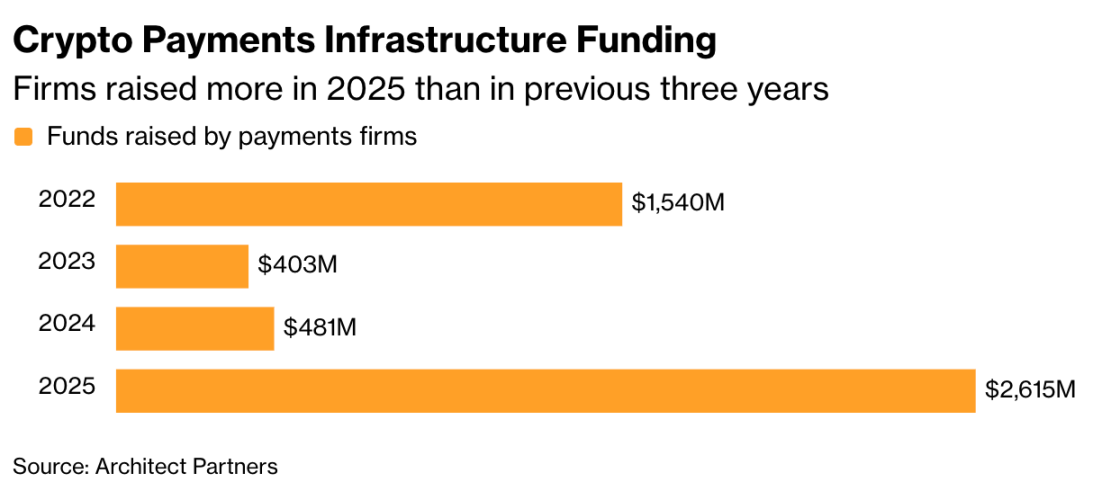 根據專注加密融資年度報告的Architect Partners統計,2025年加密支付類公司融資總額飆升至26億美元,**超越2022–2024三年總和**。在萬事達卡收購BVNK的帶動下,預期2026年該數字仍將持續攀升。