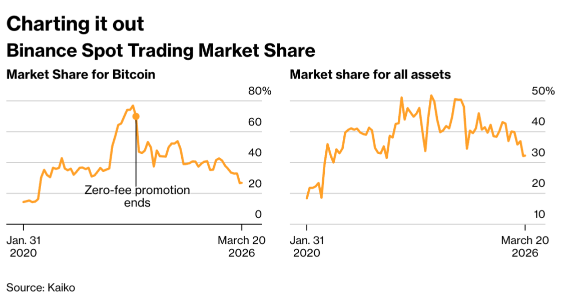 截至2026年2月,幣安在比特幣現貨交易市場份額已降至27%,全幣種交易份額則由52%滑落至32%;其利潤最高的衍生品業務份額亦同步下滑至34%。