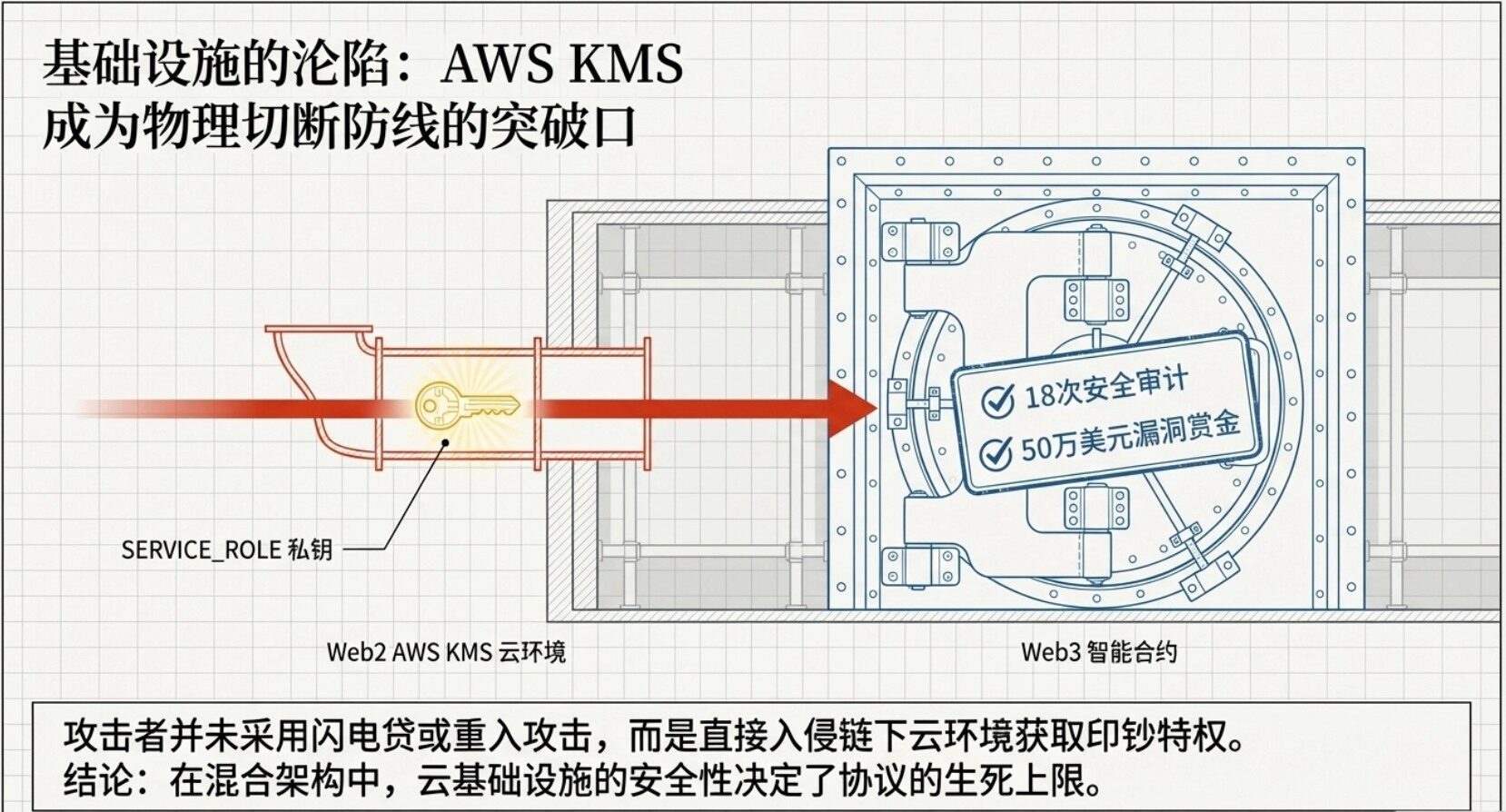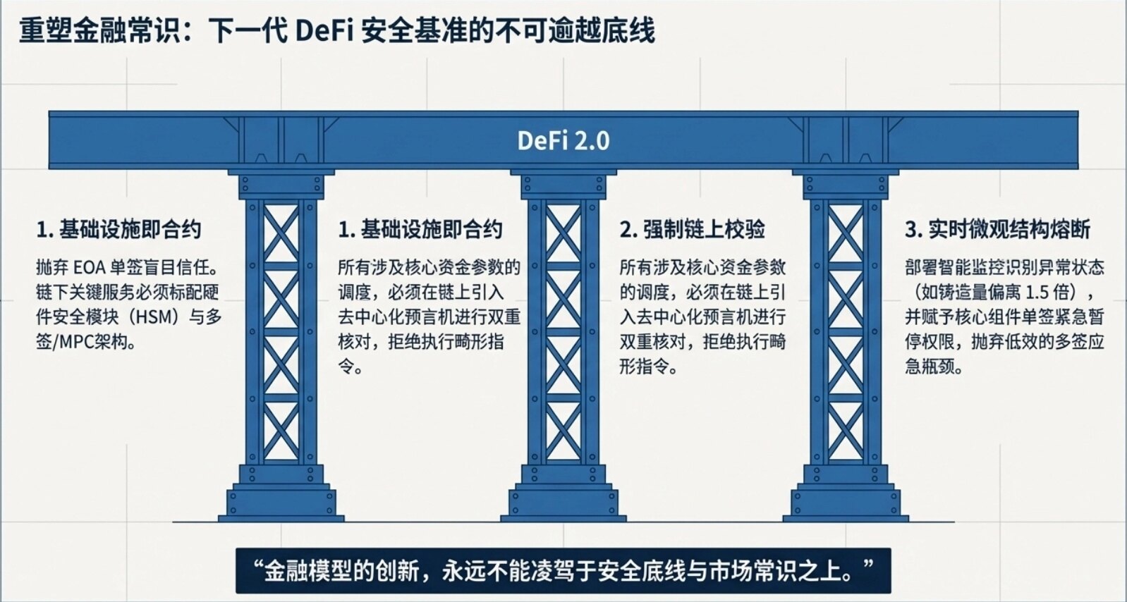 3. 基礎設施安全等同合約安全:DeFi 協議繼承其所依賴鏈下基礎設施(如 AWS KMS)的所有漏洞。私鑰管理絕不可倚賴單一 EOA 帳戶,必須採用硬體安全模組(HSM)與嚴格多重簽署機制。