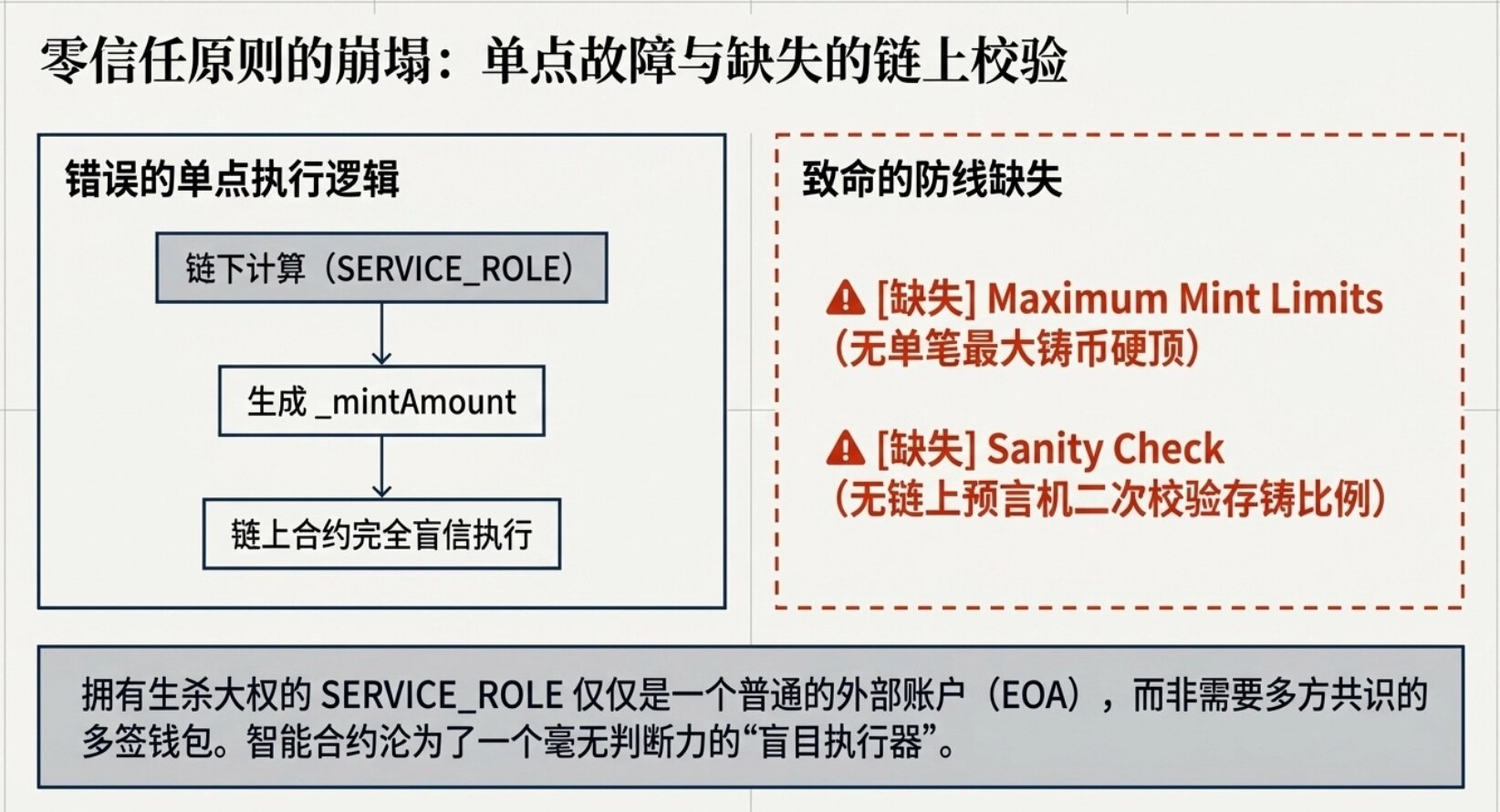 此設計嚴重違背 DeFi 「零信任」根本哲學。更糟的是,握有生殺大權的 SERVICE_ROLE 僅為普通外部帳戶(EOA),而非需多方共識的多重簽署錢包(Multi-Sig Wallet)。一旦此單一私鑰失竊,攻擊者即可任意篡改鑄造數量。