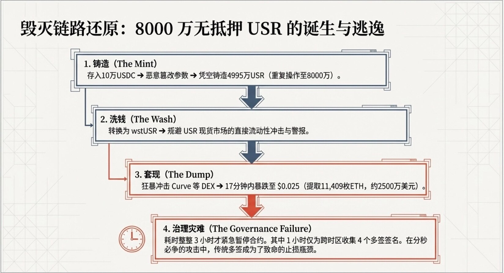 2. 重複收割:確認首波攻擊成功後,再度存入 10 萬 USDC,額外鑄造 3,000 萬枚 USR。至此,攻擊者僅耗資約 20 萬美元,即創造 8,000 萬枚毫無資產支撐的 USR。