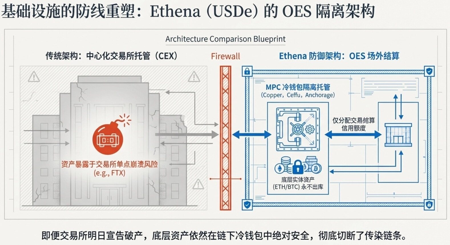 Ethena 破局關鍵在於導入場外結算(OES)架構。USDe 底層抵押資產(ETH/BTC)並不存放於幣安或 OKX 等交易所內,而是由受嚴格監管之第三方機構(如 Copper、Ceffu、Fireblocks,以及 2025 年底加入的 Anchorage Digital Bank)以 MPC 冷錢包方式託管。