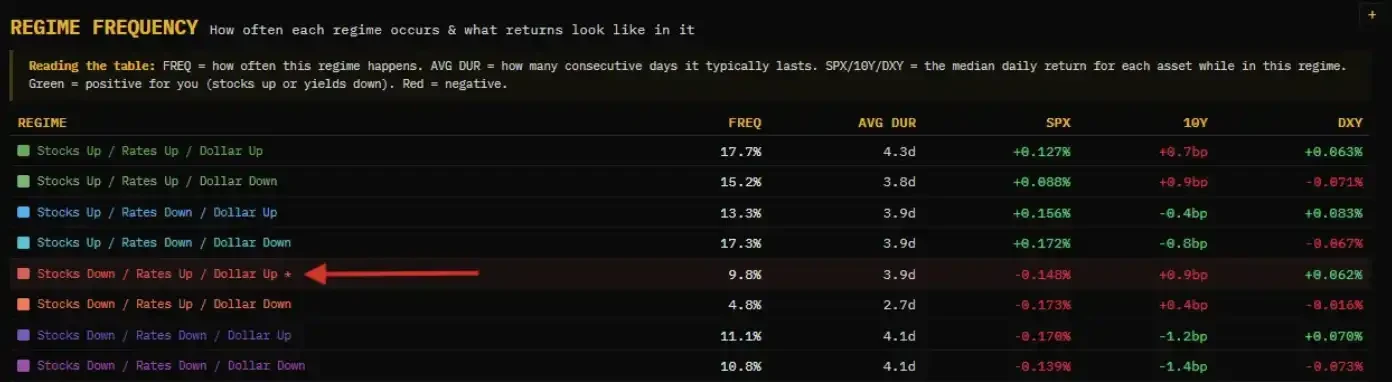上圖量化不同宏觀狀態的出現頻率與資產影響。紅箭頭所指「股市下跌/利率上行/美元走強」組合,出現機率僅9.8%,卻代表典型的滯脹或緊縮型衝擊環境:股票下跌(風險資產受損)、債券下跌(利率上行)、美元走強(流動性收緊)——三大主流資產同時承壓,幾乎無真正避風港。這正是我們當前所處之時刻:波動劇烈、恐慌蔓延,並非因衰退已成定局,而是因美聯儲任何行動都將惡化另一個核心目標。