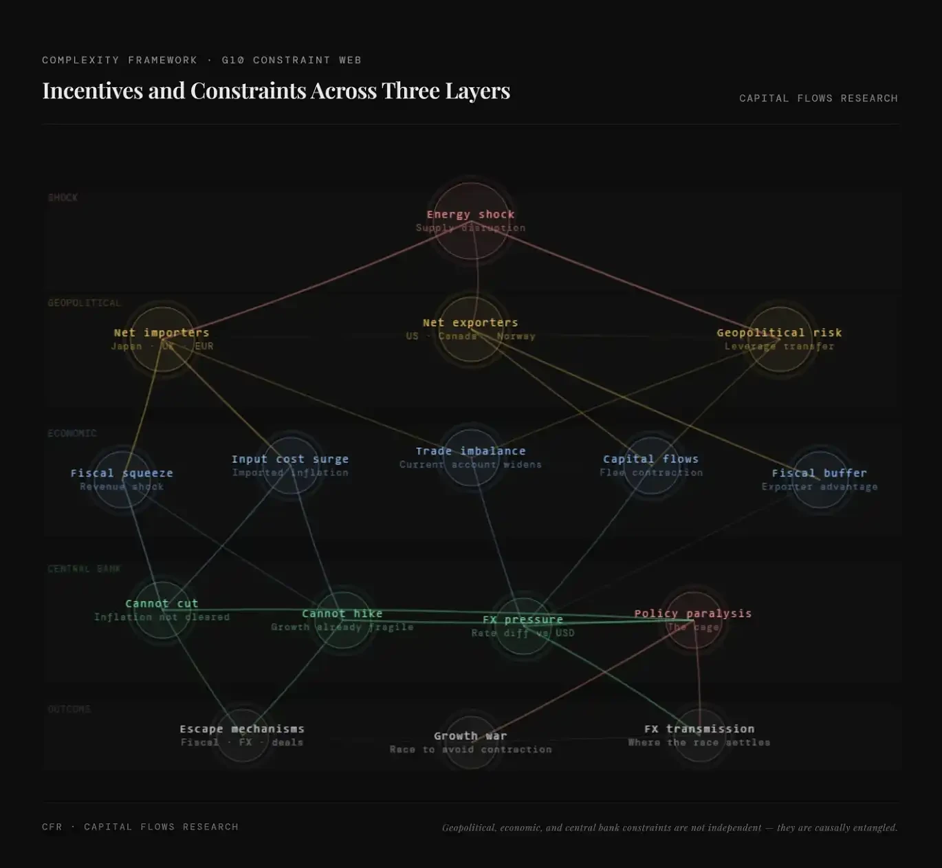 上圖系統呈現能源衝擊的多層級傳導鏈:從供給擾動出發,經地緣分化(進口國vs出口國)、經濟變量(成本上升、財政擠壓、貿易失衡、資本流動),最終抵達央行層面的政策癱瘓,並演化為「增長競賽」。核心訊息明確:當前衝擊非單一通脹問題,而是能源、資本與權力結構重構下的系統性重定價。