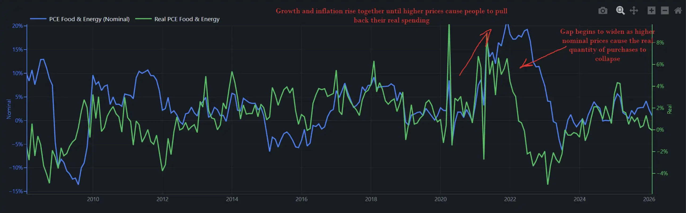 下圖顯示美國食品與能源相關支出的名目值(藍線)與實際購買數量(綠線)變化。兩者分化程度,直觀揭示通脹對真實需求的侵蝕進程。