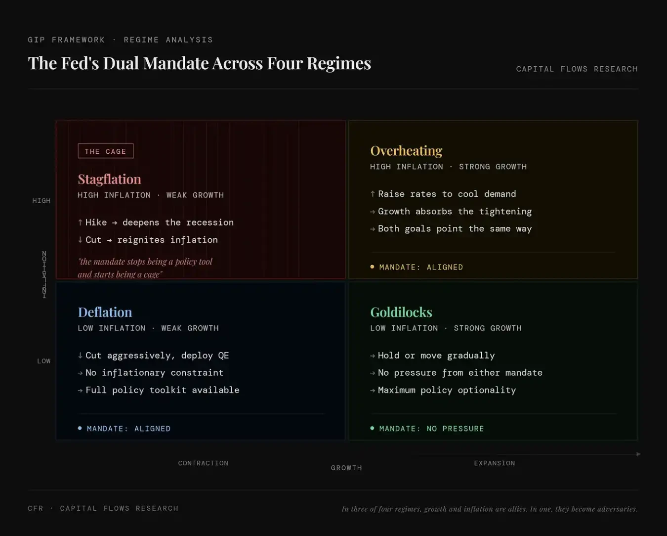 上圖呈現美聯儲雙重使命在四種典型經濟狀態下的實踐難度:左上(滯脹)為高通脹+低增長,無論加息或降息皆將加劇某一維度失衡,政策陷入根本性衝突;右上(過熱)為高通脹+高增長,加息可同步抑制通脹與過熱,目標一致;左下(通縮)為低通脹+低增長,降息空間充足;右下(金髮姑娘)為低通脹+高增長,屬理想均衡態,政策干預需求最低。