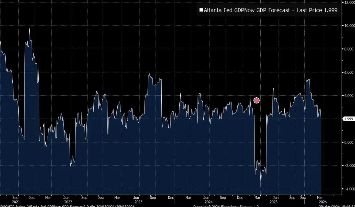 當前美國實際消費同比增速僅約2%,遠低於2022年能源衝擊期間近8%的水準。亞特蘭大聯儲GDPNow預測亦剛跌破2%——經濟正運行於「臨界增速」區間:尚未衰退,但抗衝擊緩衝已近乎消失。