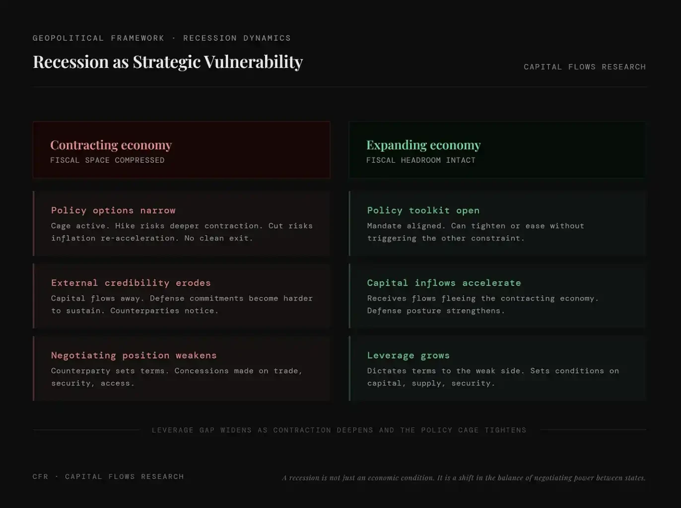機制清晰:一國陷入衰退,其財政空間、政治資本與外部信用同步萎縮。政府無法動用不存在的資源,央行亦難在不加劇收縮前提下恢復正常操作;而其在貿易、安全、資本市場等領域的對手,必將此弱勢納入談判籌碼。