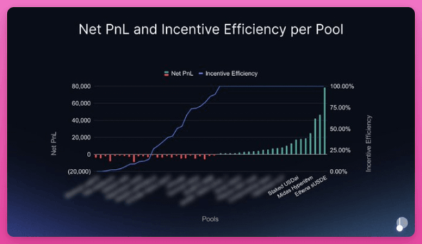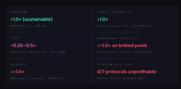 Pendle 整體比率雖 >1.0(收入 > 排放),但細分至單一池子後,逾 60% 池子本身處於虧損。高績效池承擔補貼功能,而手動衡量投票常將排放導向大戶頭寸(而非高費用產出池)。