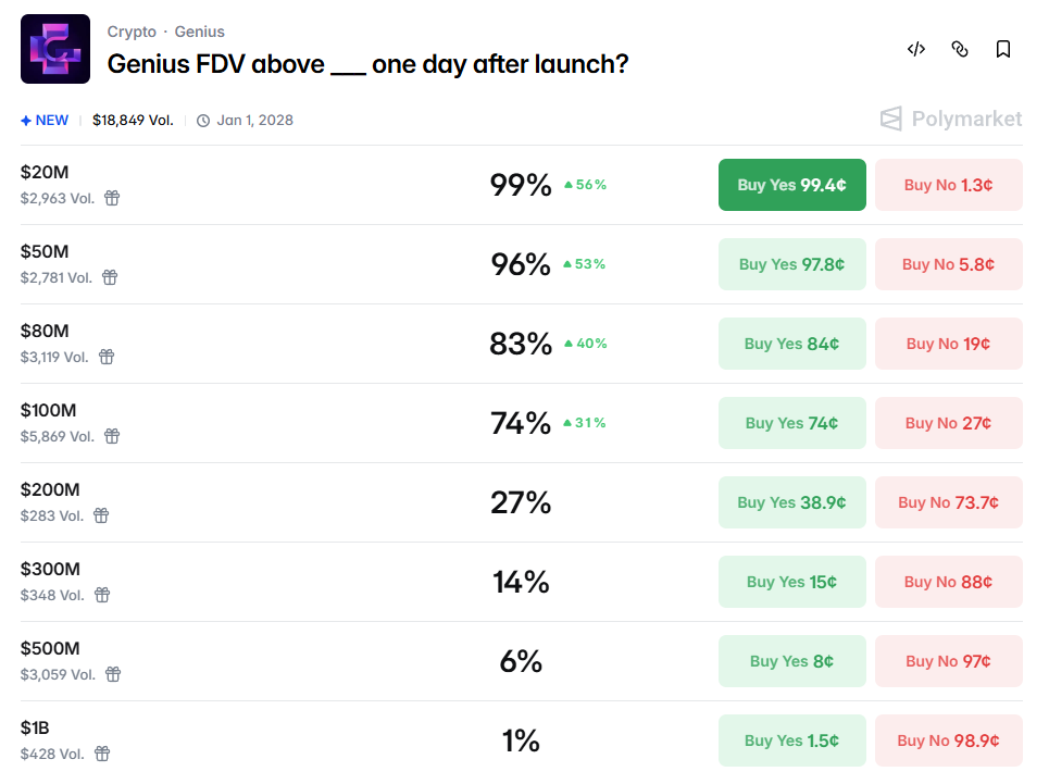 Polymarket「Genius 開盤一日後 FDV」預測市場截圖