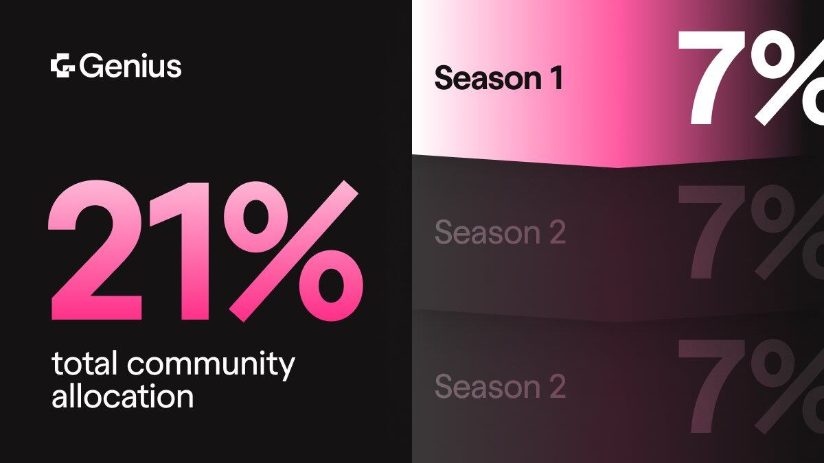 根據 Genius 官方公告,Season 1 將於 4 月 12 日前結束,且 TGE(代幣生成活動)亦將同步於該日前完成。換言之,首輪空投份額即為總供應量的 7%,共計 7,000 萬枚代幣。