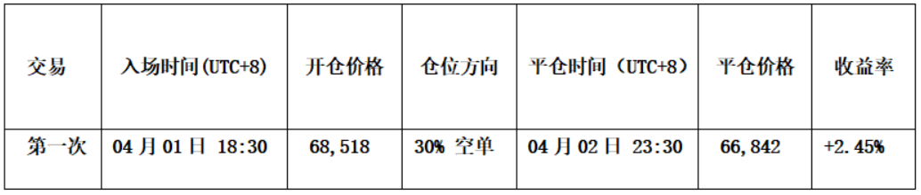 • 開倉:價格反彈至 72,000 美元遇阻,價差模型同步觸發頂部預警(白點),與動能量化模型形成沽空共振;於 68,518 美元建立 30%空單。