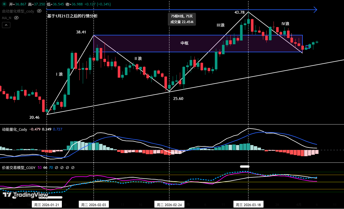 • Ⅳ浪(調整浪):自 3 月 18 日高點 43.78 美元至今,已運行 18 天,最大跌幅達 21.33%。