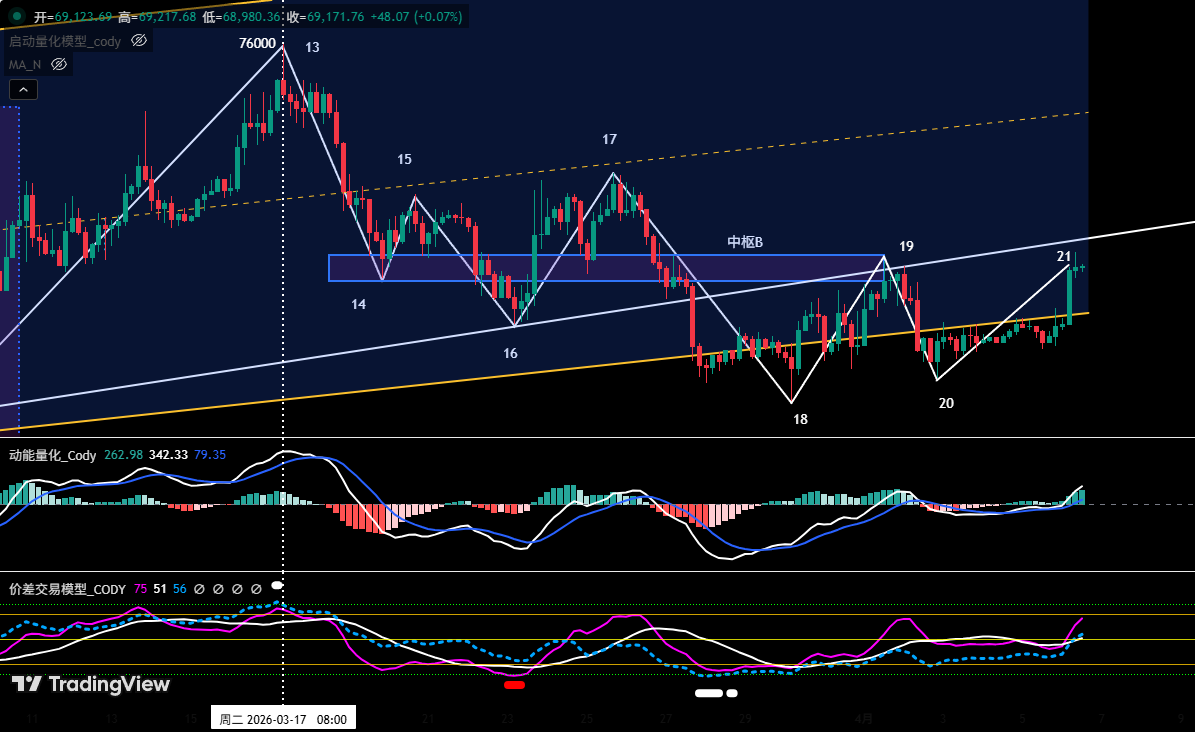 • 目前正處於 20–21 段,價格觸及中樞上軌(約 69,300 美元)附近,短期面臨方向選擇。