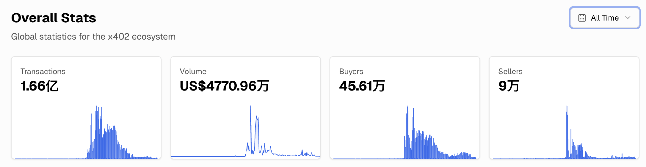鏈上數據更直觀反映生態降溫:x402 協議日交易筆數,從 2025 年 11 月高峰約 380 萬筆,萎縮至當前僅數萬筆;日交易量亦從逾 200 萬美元,回落至最近一兩萬美元。