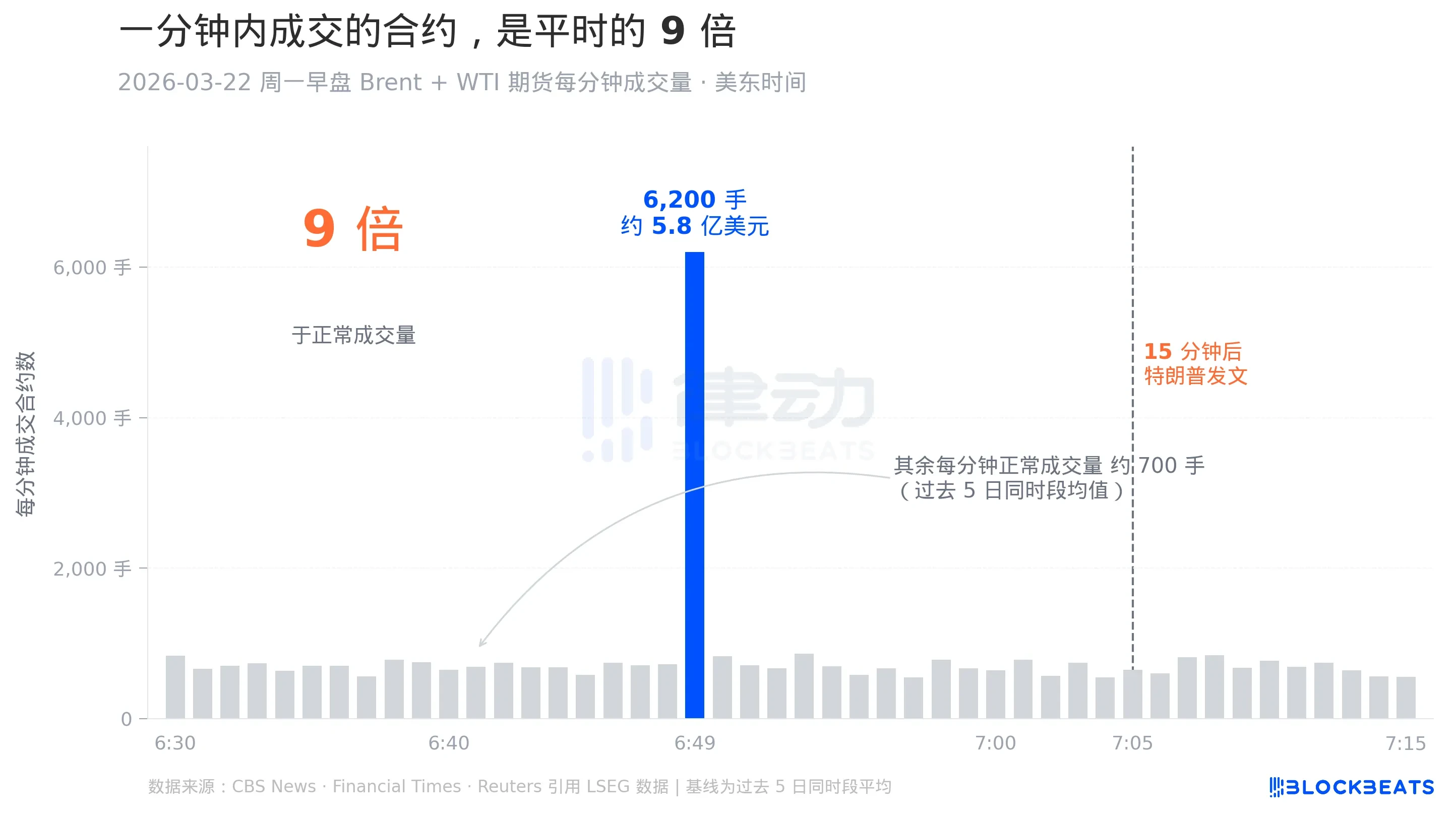 首次發生於 2026 年 3 月 22 日週一早盤。根據 CBS News 與《金融時報》(Financial Times)援引的交易數據,美東時間上午 6:49 至 6:50(即 GMT 10:49),布倫特與 WTI 原油期貨於一分鐘內合計成交 6,200 手,名義金額約 5.8 億美元。
