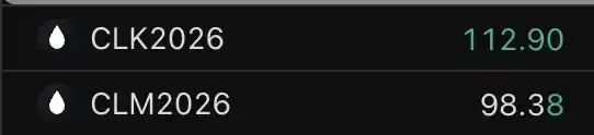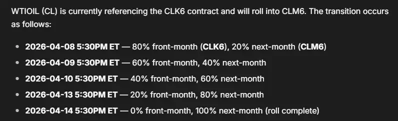 2026 年 3 月底至 4 月初,WTI 原油期貨曲線呈現強烈近高遠低結構:5 月合約(近月)持續大幅高於 6 月合約(遠月),價差一度擴大至 14 美元以上。