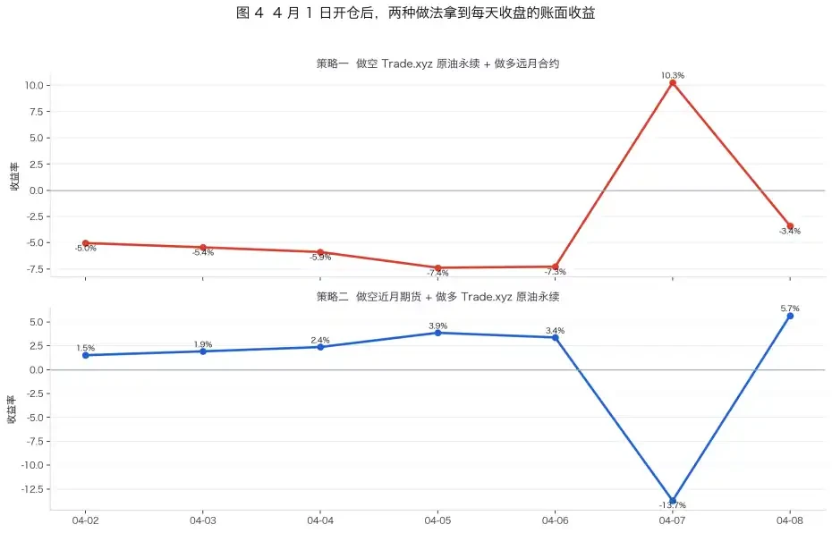 以 4 月 8 日為例:於 Trade.xyz 以 95.352 美元做空 WTI 永續合約,同步於 CME 以 87.75 美元做多 6 月期貨,名義本金各 10,000 美元。理論價差收益為 7.602 美元/桶,總計約 797 美元。然而當日單日資金費率已達 1.42%,按剩餘 6 日展期推算,空倉累計支出資金費約 851 美元——尚未計入手續費與滑點,淨收益已為 -53 美元。
