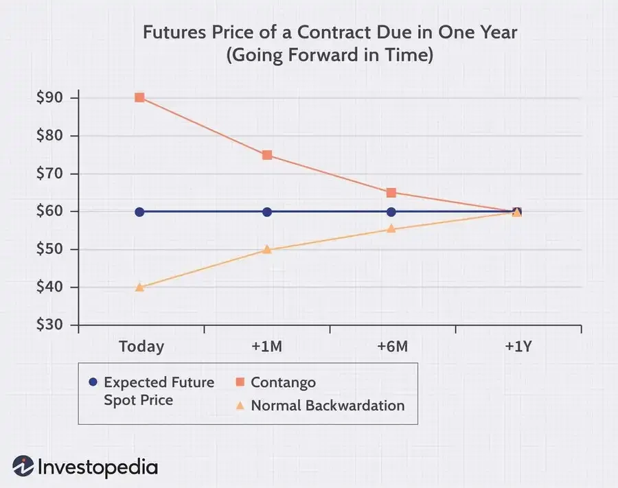一般情況下,遠月合約因涵蓋儲存、保險與資金成本,價格高於近月合約,此結構稱為「Contango」(期貨升水);相反,若近月價格高於遠月,則稱為「Backwardation」(現貨溢價),通常反映當下供應緊張、實體需求迫切,市場願意為「立即取得原油」支付溢價。
