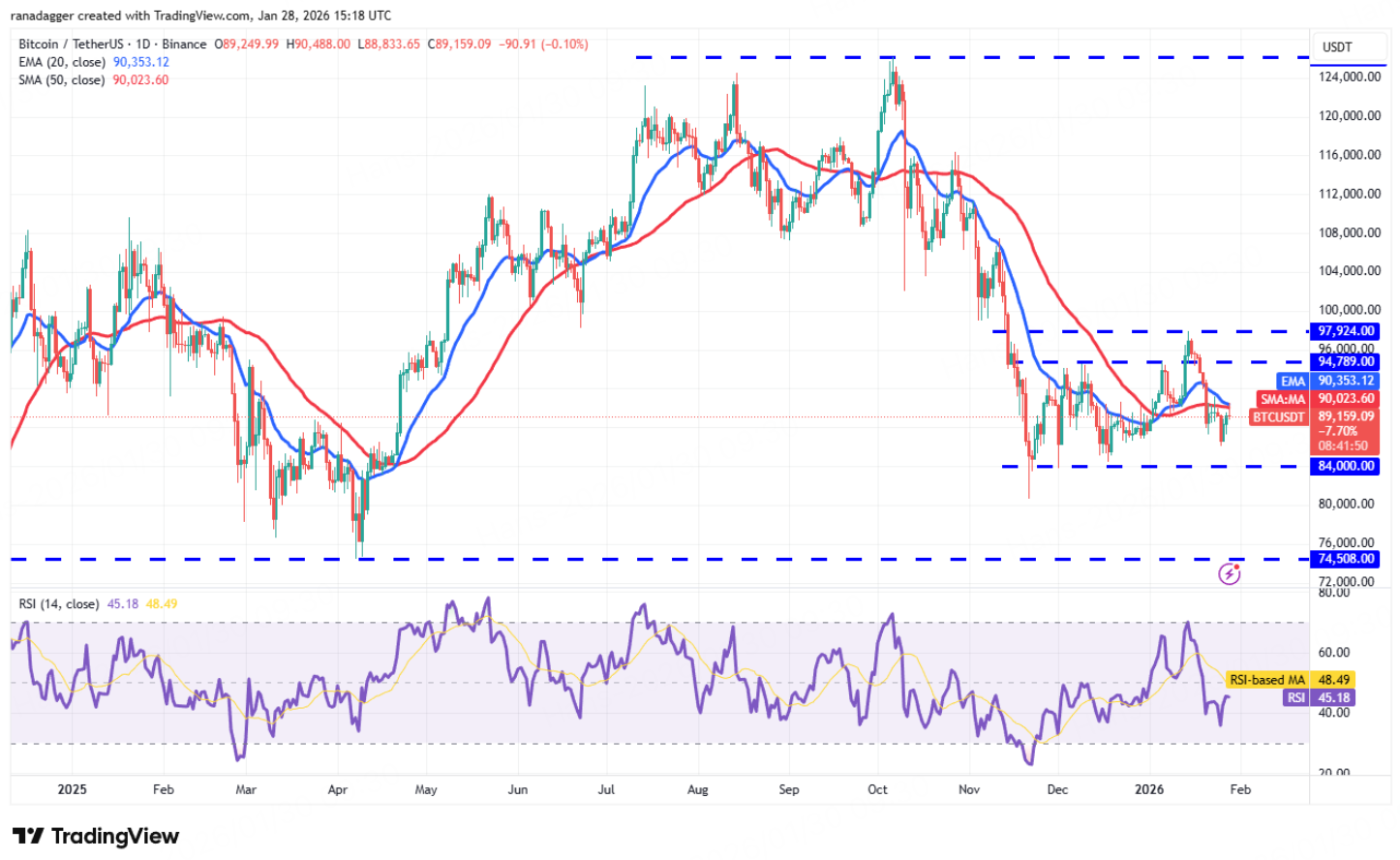 BTC於20日EMA(約$90,521)承壓回落,並有效跌破上升趨勢線,短期結構由多轉空。RSI運行於零軸下方,20日EMA已現平頂下彎跡象。任何反彈均屬技術性修復,上方拋壓密集。若無法重返均線之上,首道支撐位於$84,000;失守後恐下探$80,600,市場情緒將顯著轉弱。反向情境下,站穩均線並突破$97,924,方確認空頭力竭。