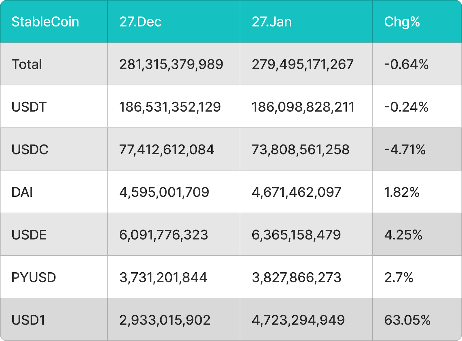 1月穩定幣總流通量微減18.2億美元(-0.64%),其中USDT僅流出0.24%,穩居結算與儲值核心地位;USDC則大幅流出4.71%,反映部分合規資金轉向新興場景。值得注意的是,USD1單月流通量飆升63.05%,成為增速最快穩定幣;USDE與DAI亦分別增長4.25%與1.82%。此一結構性變化,凸顯資金正從傳統穩定幣向具備明確監管路徑、創新機制與跨境支付定位的新一代穩定幣遷移。