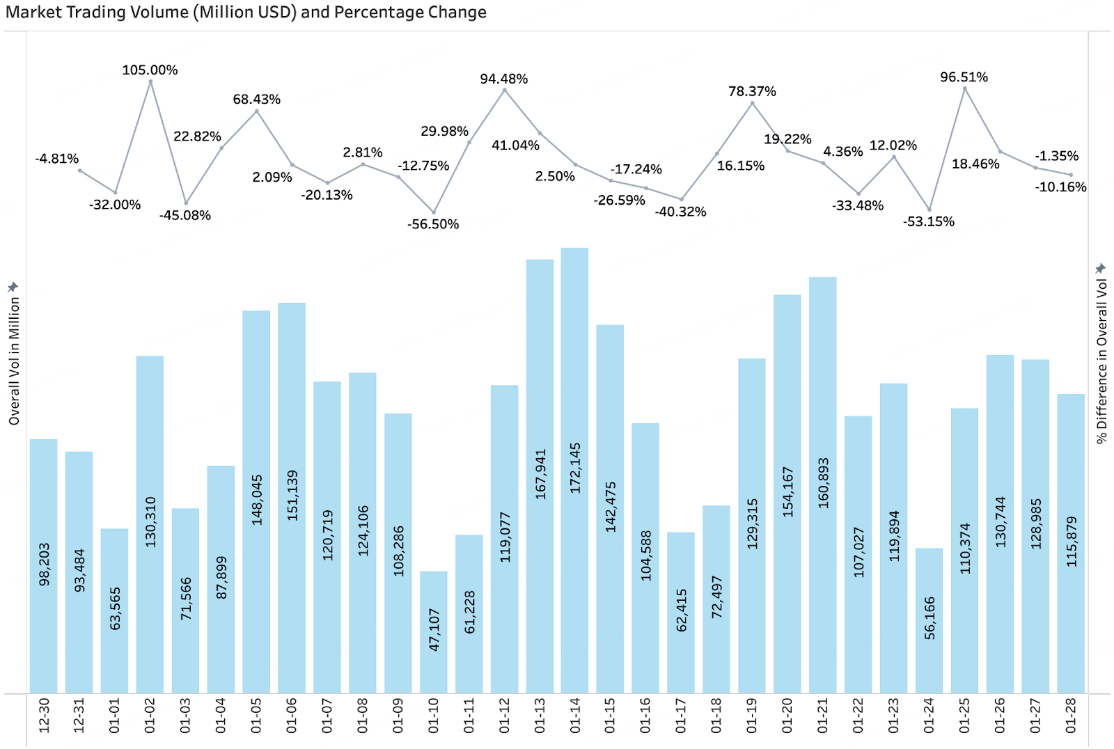 據CoinGecko統計,1月加密市場日均交易量介於1100–1600億美元,多次短暫放量後迅速萎縮,反映資金仍以事件驅動與短線博弈為主,缺乏中長期配置型資金持續流入。全市場總市值維持於3.00–3.37兆美元區間,日漲跌幅多數控制在±1%內,顯示多空力量趨於均衡,短期難破區間框架。