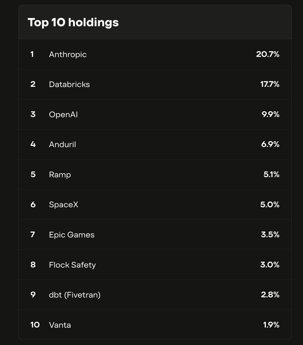 它並非傳統企業,而是一檔封閉式基金。基金資產主要由 Anthropic、OpenAI、SpaceX 等尚未上市的頂級私有科技公司股權構成。其中,Anthropic 持倉占比達 21%,OpenAI 占 10%。