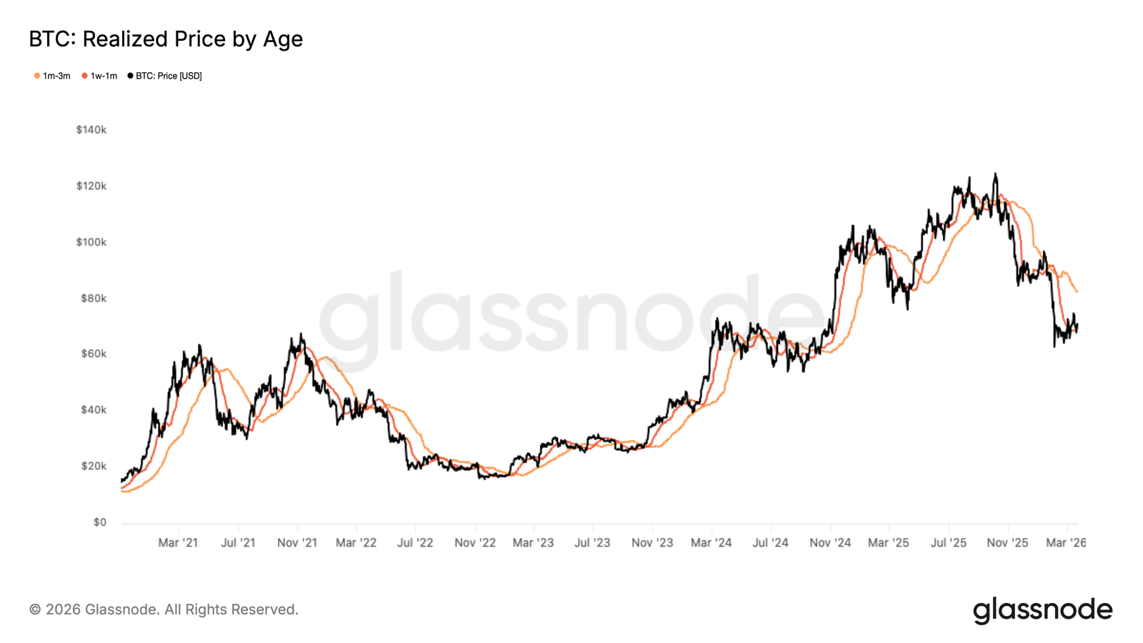 按持有時間拆分的「已實現價格」進一步揭示不同投資者群體的成本分佈。其中,持有 1 週至 1 個月者平均成本約為 70,200 美元,已初步形成動態支撐;而持有 1–3 個月者成本則集中於 82,200 美元,與前述 STH 供應帶共同構成中期關鍵阻力。