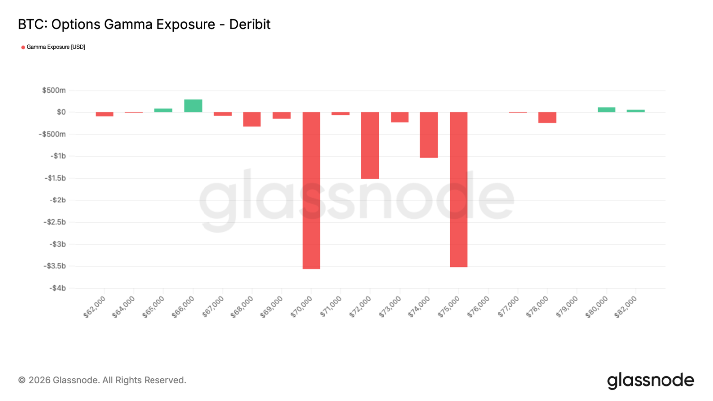 3 月 27 日(週五)為周度、月度及季度期權共同到期日。當前做市商整體處於短 Gamma 狀態,風險敞口集中於 70,000–75,000 美元區間;在此薄流動性環境下,價格易現雙向加速波動。