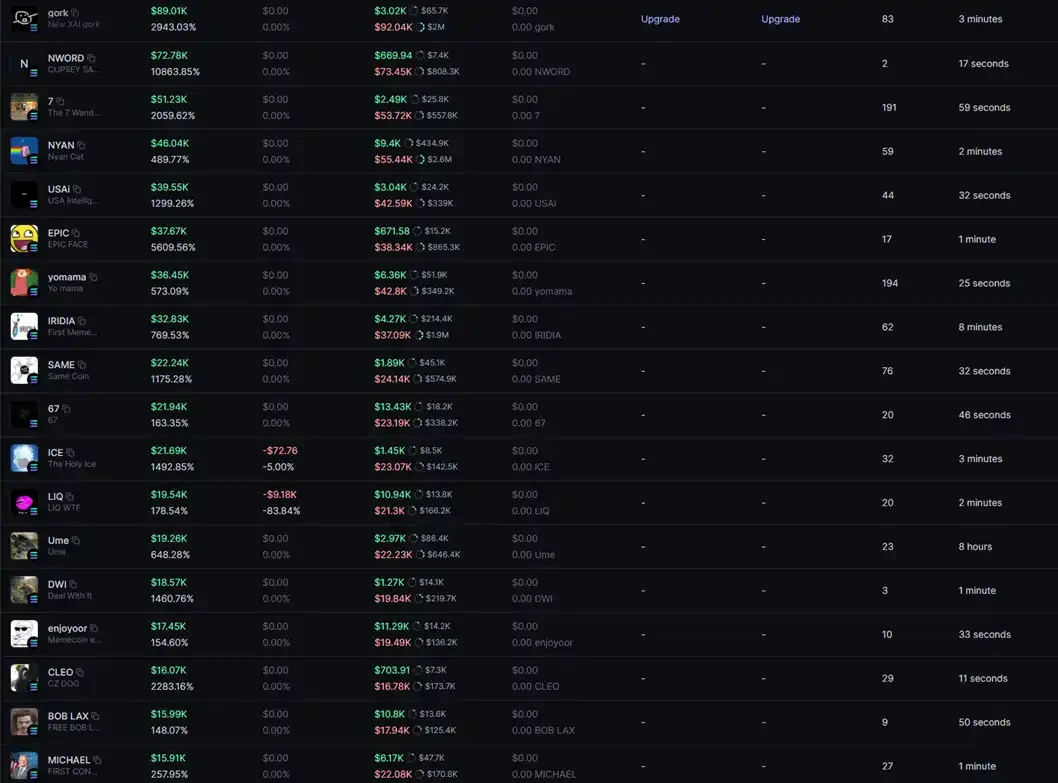 值得注意的是:他的千萬美元盈利,無一來自「長期持有」的「大結果」。單筆最高盈利來自 $gork,僅約 9 萬美元;其餘多數利潤,則來自大量名不見經傳、甚至我們從未聽聞的 Meme 幣。