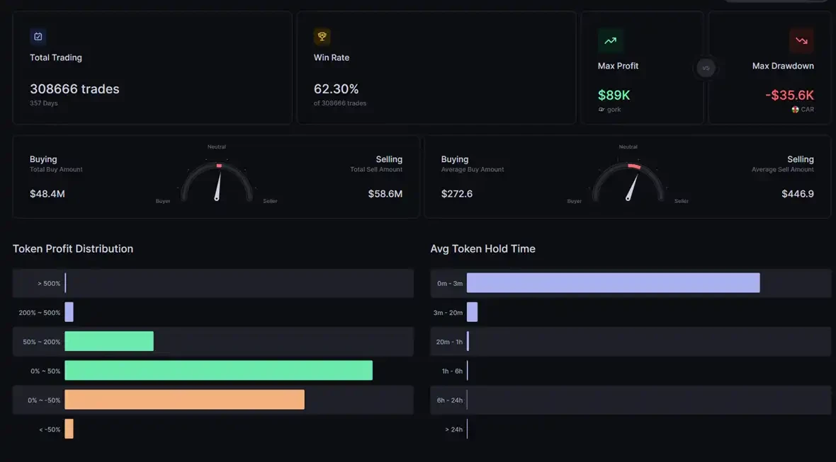 過去 30 天實現利潤約 72.7 萬美元;過去 7 天達 19 萬美元。支撐這筆巨額收益的,是 357 天內累計 308,666 筆交易——勝率 62.3%,平均持倉時間中位數僅 7 秒。