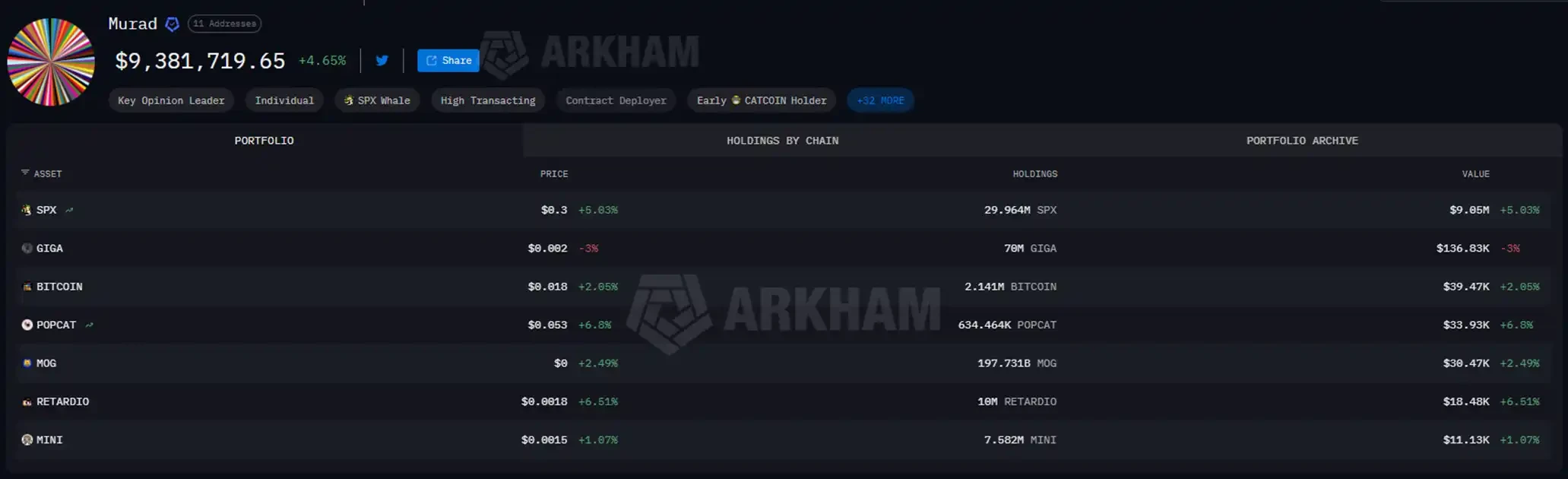 與此同時,曾以「Believe in something」廣為人知的 KOL Murad,其帳戶峰值資產高達 5,000 多萬美元,如今僅餘約 938 萬美元。