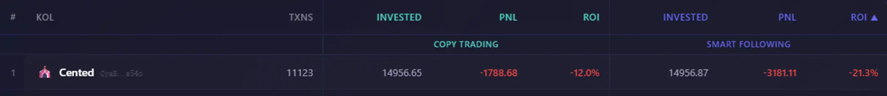 cookin.fun 對 Cented 等 KOL 進行模擬跟單測試:以 10 秒真實延遲跟進交易,並於 10 分鐘後統一止盈/止損。結果顯示——跟單 Cented 的總收益率為 -21.3%。