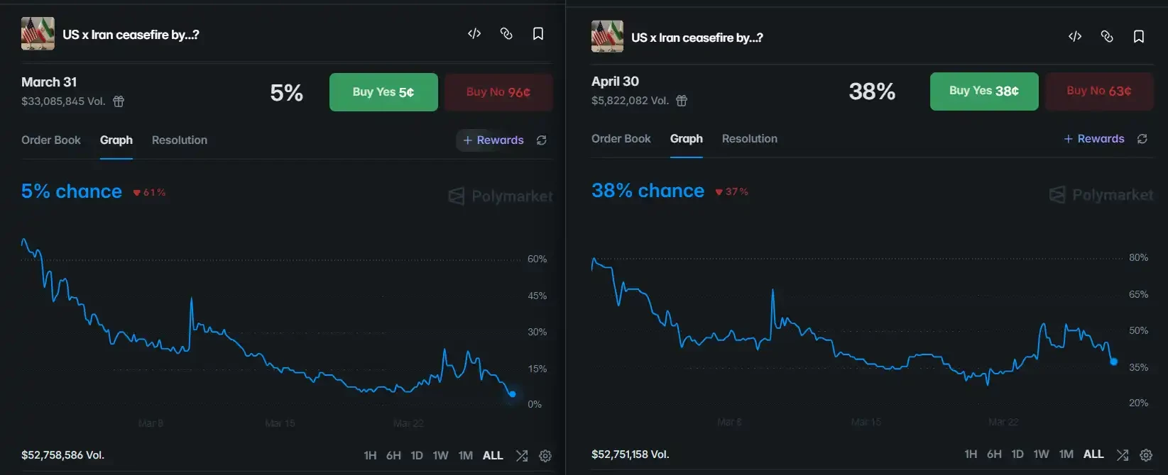 截至3月27日,這6個賬戶已投入28.5萬美元押注「4月30日前停火」,其中18.5萬美元集中於「3月31日前停火」子市場。若其預測能力非純屬偶然,則背後隱含的訊號極具解讀價值——停火或非妥協,而是雙方基於現實利益的理性選擇。