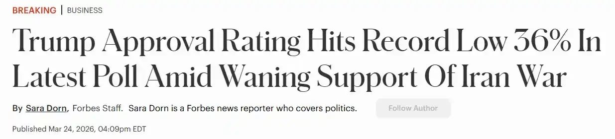 政治層面壓力同樣空前。小布希發動伊拉克與阿富汗戰爭時,支持率分別高達72%與90%;而本次軍事行動首日,特朗普支持率即低於40%,且經典的「聚旗效應」完全未現。截至3月25日,其整體支持率已跌至36%,創第二任期新低。