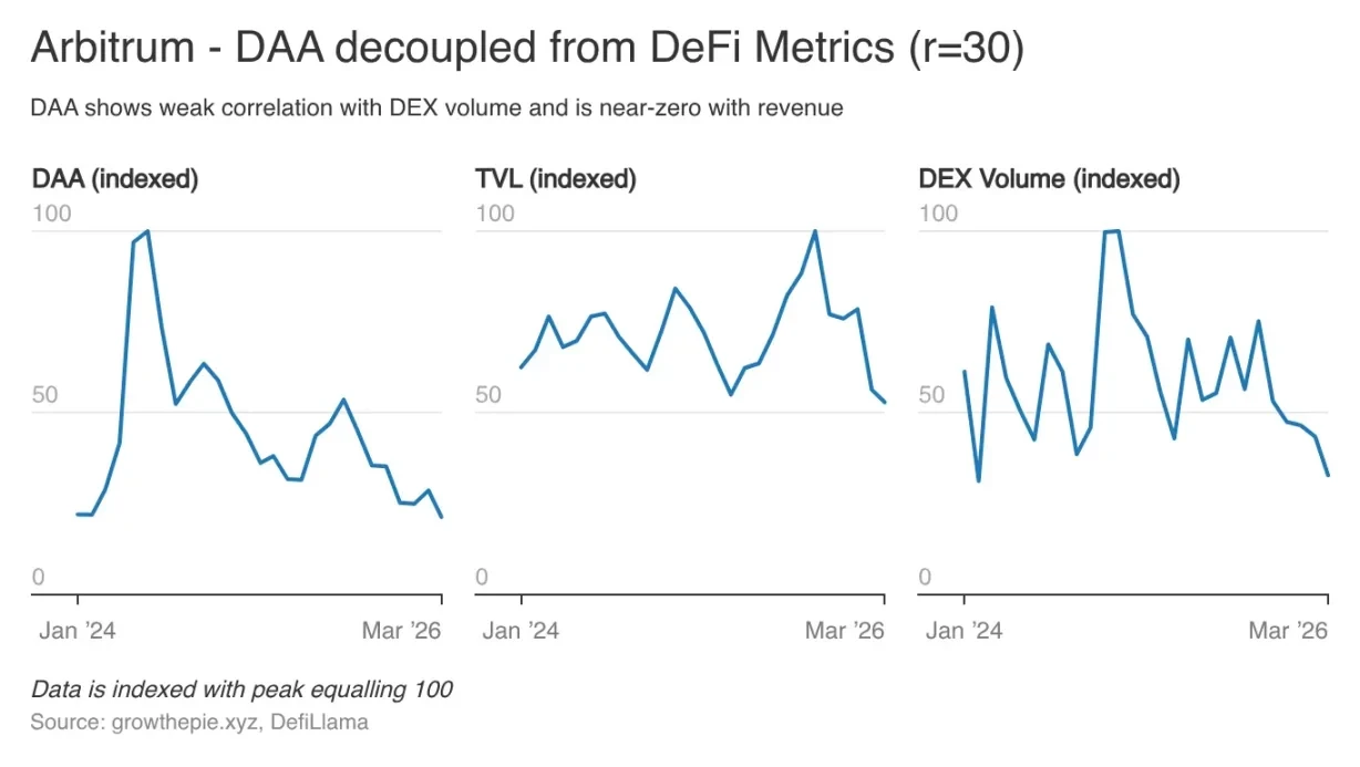 Arbitrum 日活地址在 2024 年 6 月達到 74 萬峰值,如今 15.7 萬,同樣暴跌 79%。兩條鏈都在下滑,但底層邏輯完全不同。