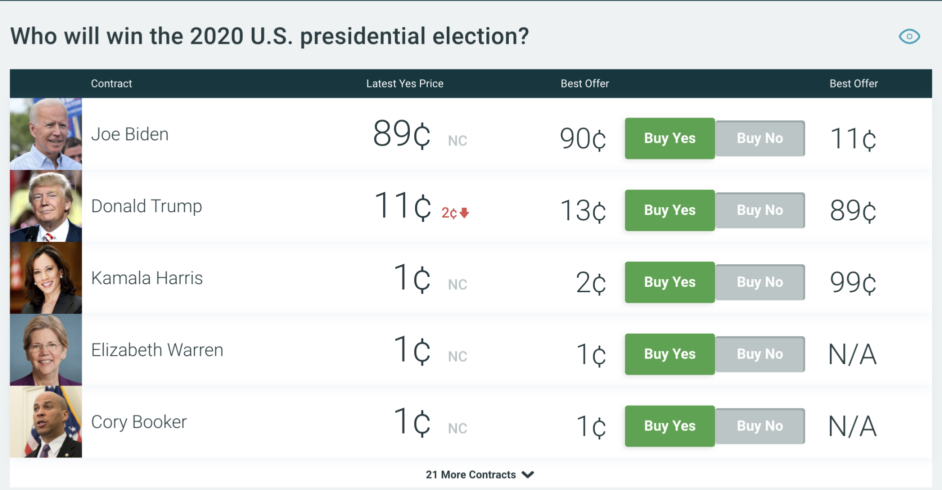 PredictIt 上 2020 年美國總統大選預測市場