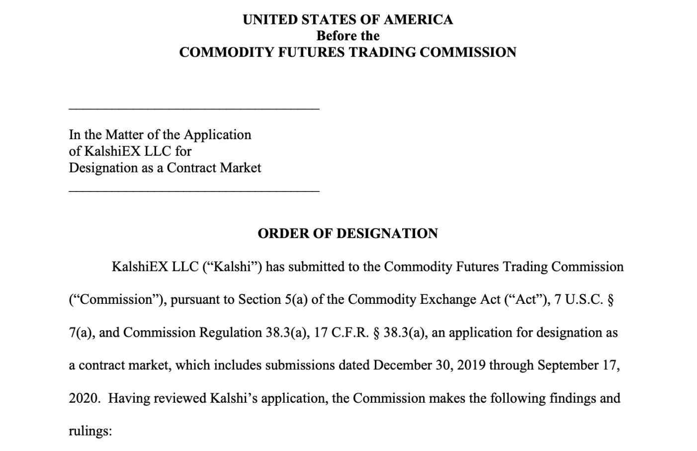 Kalshi 獲批 DCM 牌照的官方文件截圖