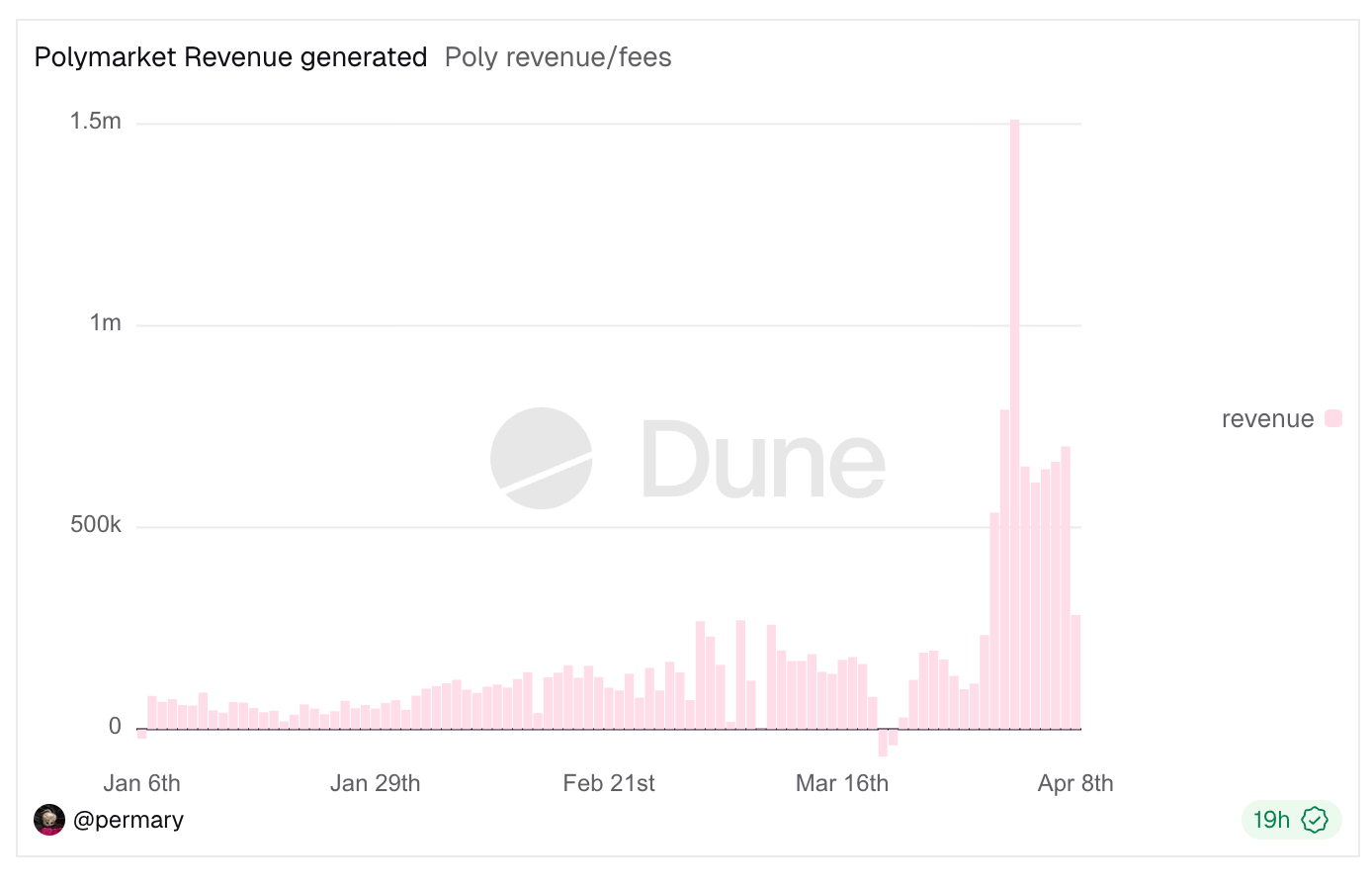 最新代表案例是 Polymarket。自近期擴大手續費覆蓋範圍並重構計費公式後(詳見〈硬核拆解 Polymarket 手續費公式:90%+ 的極端費率是如何蹦出來的?〉),其營收能力大幅躍升。截至發稿,總手續費收入已突破 2,400 萬美元;僅 4 月 2 日單日便達成 150 萬美元收益紀錄。