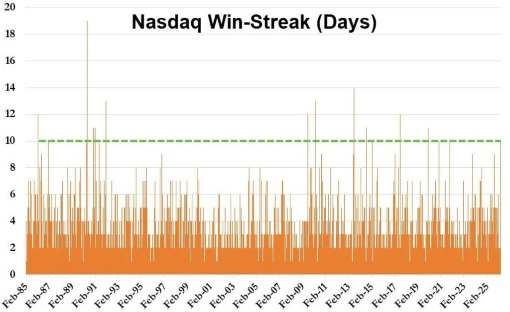 近期,華爾街正展現出「選擇性屏蔽噪音」的特徵。標普500指數自3月27日以來累計上漲近10%,納斯達克100同期漲幅約12%,更連續10個交易日收漲——創下該指數自2021年以來最長連漲紀錄。